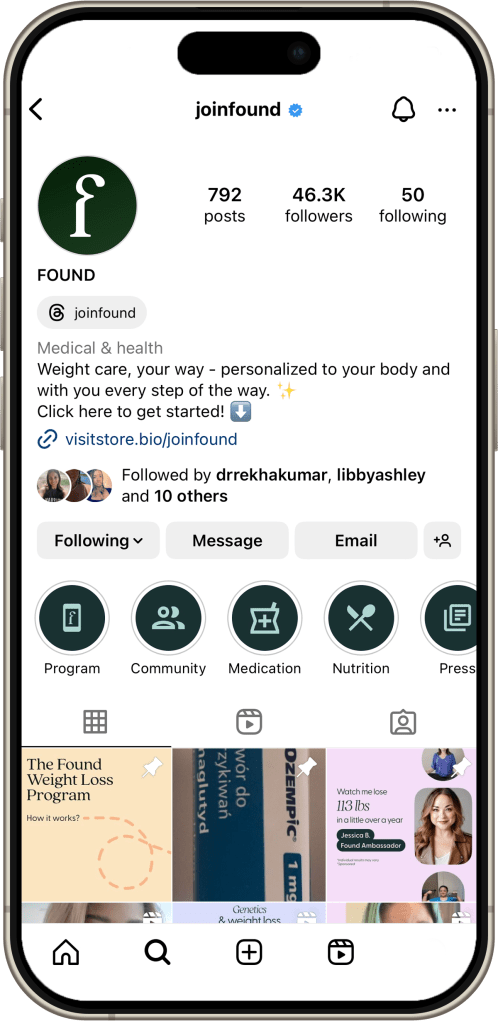 A telehealth obesity medicine clinic, Found brought me in-house to act as their Senior Social Media Manager, with the goal of generating organic awareness and ultimately driving site traffic for the telehealth startup. Within a year, I increased Found’s following by 30% on Instagram & 59% on TikTok by ideating, creating, and posting social-first video content across platforms.